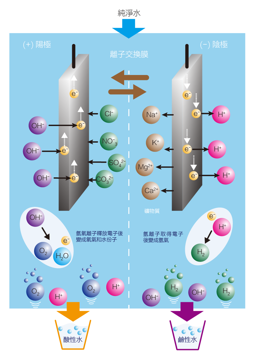 經過淨水濾芯之後,純淨水會進入電解系統並流進正極槽和負極槽。負極槽中的負極電解板把水離子化並變成鹼性。同樣,正極槽中的正極電解板把水離子化並變成酸性。